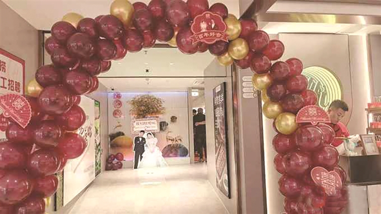 赵小姐告诉记者,原本自己和先生定了5月1日在当地一家酒店举行传统婚宴仪式,没想到4月25日收到酒店通知,酒店由于特殊原因停业,无法承接婚宴了。得知这一消息后,赵小姐和先生紧急商量解决办法,“一个朋友提议,可以去海底捞办婚礼。”赵小姐说,“我和先生都是海底捞的粉丝,这次碰到意外,想着索性就创新一把吧!”4月26日,他们和海底捞店家表达了办婚礼的意愿,“我们选的这家海底捞能容纳约500人,我们一共140名亲友,相当于半包场。店家很热情地答应了我们的预订,还帮我们装饰了喜庆的墙面和灯牌。”婚礼当天,这家海底捞一片喜气洋洋,门口摆上了新人的人形立牌,还装饰了红色气球拱门。赵小姐和先生表演了一段舞狮,“这是我们临时学的,道具刚刚收到就上阵了,我们觉得舞狮代表着吉祥纳福,是传统文化的一部分,我们就是借这个形式,讨个好彩头。”