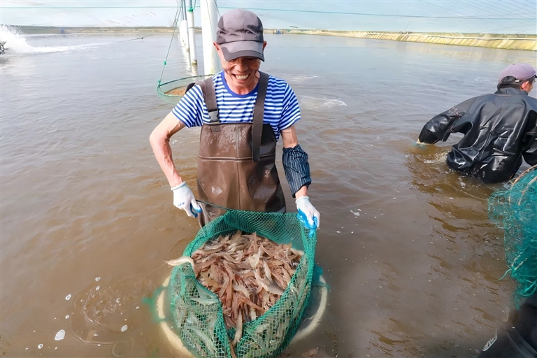 当天下午,定海小沙街道长白大满养殖场,笔者看到养殖塘内,工作人员们正在放笼、撒料、收笼、装虾……相互配合着将一筐筐南美白对虾送上活鲜运输车,运往本地市场及各大餐饮企业。