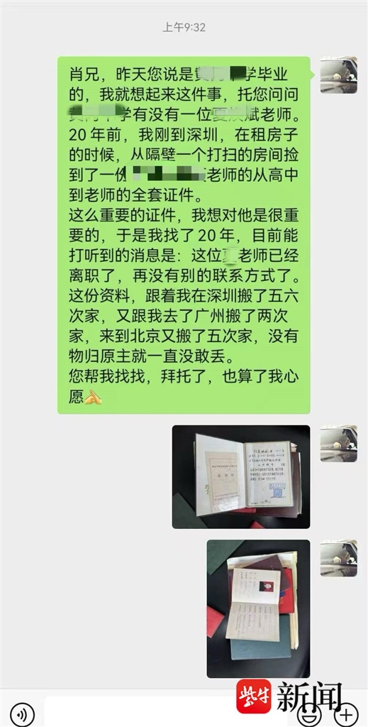 “我是化学老师,当时30多岁,到深圳一所学校短暂工作了一段时间,后来还是决定回湖北黄冈工作,走时有些急匆匆。”顾老师向记者回忆,当时他租住在深圳福田区一间一室一厅的房间,当时走得急,这一包证件估计放在抽屉里面没有拿出来。