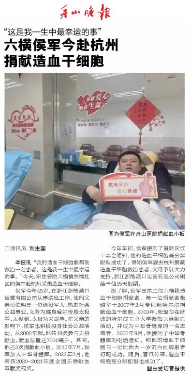 “我的造血干细胞能帮助救治一名患者,这是我一生中最幸运的事。”5月8日,家住普陀六横镇东靖社区的侯军赴杭州采集造血干细胞,临行前说的这句话感人至深(《舟山晚报》5月8日报道)。