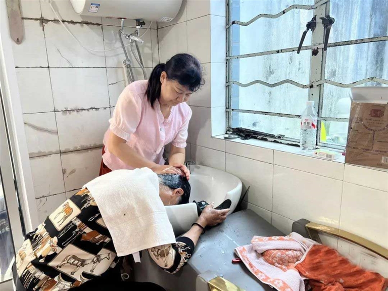 从洗头到理发,再到修面,在孙爱珍这里,老人理一次发需要大半个小时。