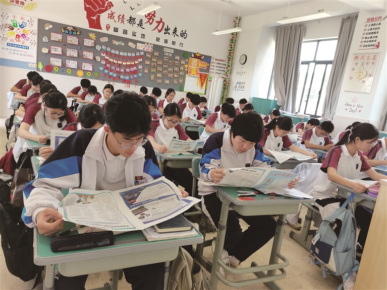 《舟山晚报2025“赢战中考”特刊》(以下简称“中考特刊”)已于近日陆续送达我市部分学校。这份带着墨香的报纸,学生们争相翻阅,走廊上、教室里,学生们三五成群围在一起,备考的紧张与求知的渴望交织成一曲激昂的青春乐章。