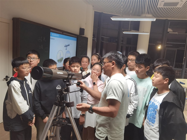 讲座环节,市天文学会工作人员通过提问互动、图片展示以及现场模拟等形式,讲解了光的基本概念、光的反射和折射原理以及望远镜的分类与使用方法,学生们轻松理解了原本晦涩的科学知识,现场气氛热烈。随后,学生们在志愿者老师的指导下,实地观测了月球和木星,亲身感受了宇宙的神奇与浩瀚。
