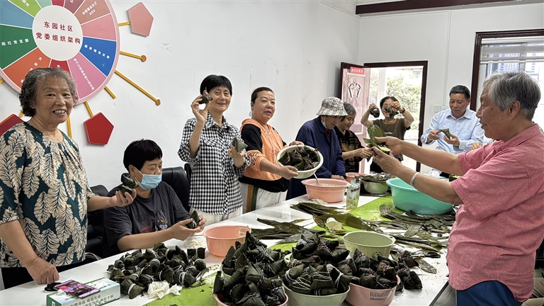 昨天,定海城东街道东园社区开展了“浓情端午节 粽香暖人心”活动。大家围在一起,捋粽叶、折漏斗、填糯米、绑线绳……一张张翠绿的粽叶、一盆盆新鲜的糯米在大家巧手中变成了一个个棱角分明的粽子。随后,社区工作人员与志愿者将这些爱心粽送给辖区内孤寡老人。通讯员 贝怡 摄