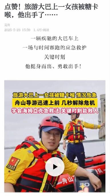 5月22日,舟山开往丽水的大巴车上,一女童被糖果卡喉,危急时刻,导游胡高杰立即运用海姆立克急救法,经专业背部叩击,5秒内成功吐出异物,解除危机(5月24日《舟山晚报》报道);5月19日,公交229路司机夏宏斌在沈家门大蒲湾站,遇老人手卡扶手,迅速用洗洁精润滑助其脱困(据5月21《舟山晚报》)。