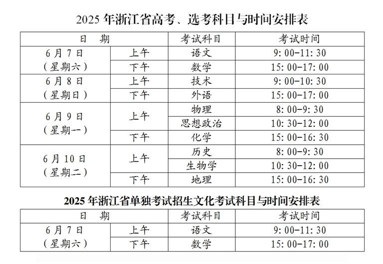 据舟山教育考试微信公众号消息 2025年高考(选考、单独考试)即将来临,考生们需提前熟知各科目考试时间,规划好赴考行程,以严谨的态度和充分的准备迎接高考。现提醒如下: