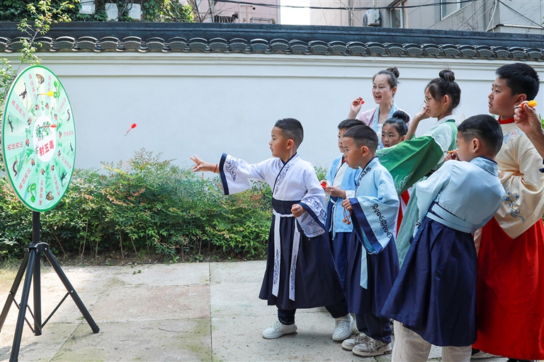 定海古城,小朋友们身穿汉服体验“射五毒”等传统游戏 图/陈炳群
