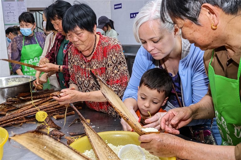 定海区金塘镇山潭文化礼堂,外国友人与村民们一起包粽子过端午 图/姚峰