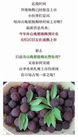 舟山晚稻杨梅“千呼万唤始出来”,本地市场给外地杨梅留出了不短的销售期。“有来无往非礼也”,舟山晚稻杨梅上市后,应当借着外地杨梅纷纷落市的机会,大张旗鼓地“走出去”。只有这样,才能走出小年愁歉收、大年愁滞销的怪圈,赢得丰产又丰收。