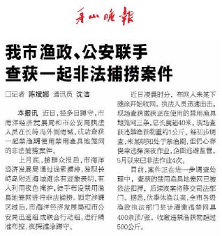 市海洋经济发展局和市公安局执法人员经多日蹲守,近日在长峙岛外侧海域成功查获一起非法捕捞案件,在禁渔期使用禁用渔具地笼网偷捕的朱某被当场人赃俱获(《舟山晚报》6月4日报道)。茫茫大海在数月的禁渔期能否“风平浪静”,就要靠一丝不苟“守”出来。