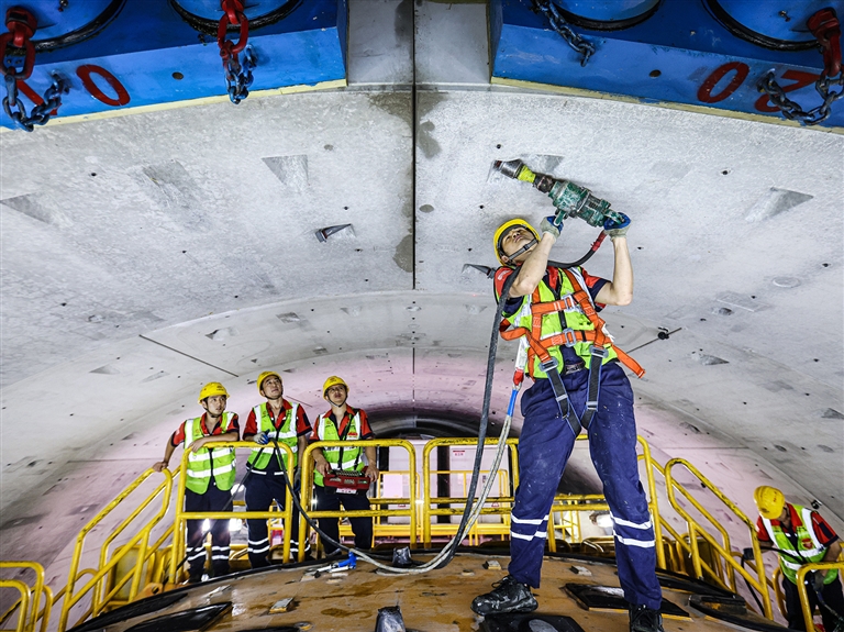 据介绍,金塘海底隧道穿越的地层为长距离硬岩、黏土、粉砂等多种地层组合,盾构区间硬岩和软硬不均地层占比近七成,最高强度达200兆帕,相当于在花岗岩中掘进,具有高强度、高水压、高精度、高风险等施工特点。截至目前,舟山侧已累计完成23次开仓换刀作业,更换刀具326把,开仓压力由初始的2.9巴增加至5.9巴,实现高水压地层盾构连续掘进零中断的技术突破。