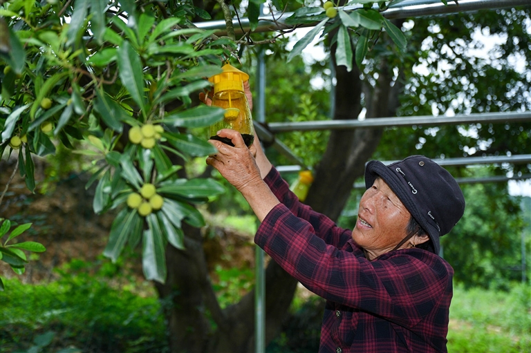 6月4日,定海区白泉镇河东村果农林汗芬正在自家杨梅林里将盛有引诱剂的小瓶子悬挂在树枝上。当前正值晚稻杨梅转色关键期,这种绿色防控技术能有效诱捕果蝇,减少病虫害对转色期杨梅的侵害,确保果实品质和产量。据介绍,今年是杨梅大年,作为舟山晚稻杨梅主产区之一,河东村引导果农们通过科学管护,精细化管理等措施助力杨梅提质增效,今年总产量预计达6万公斤。记者 沈磊 摄