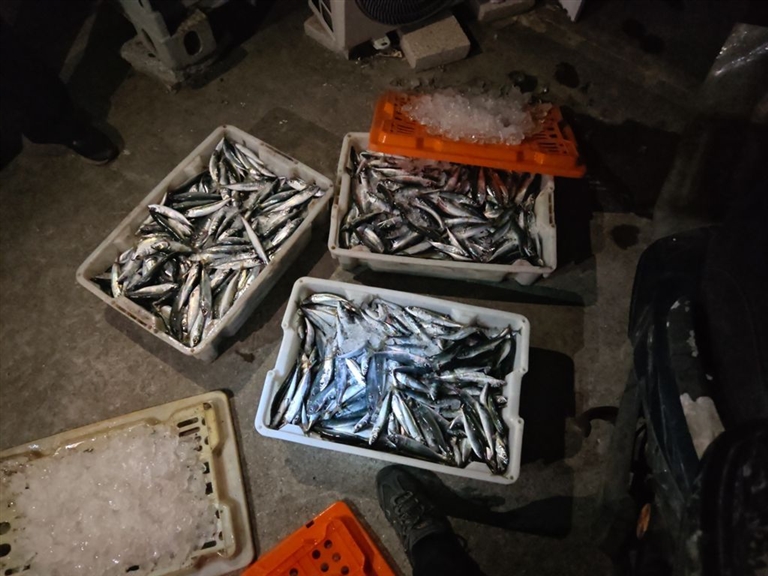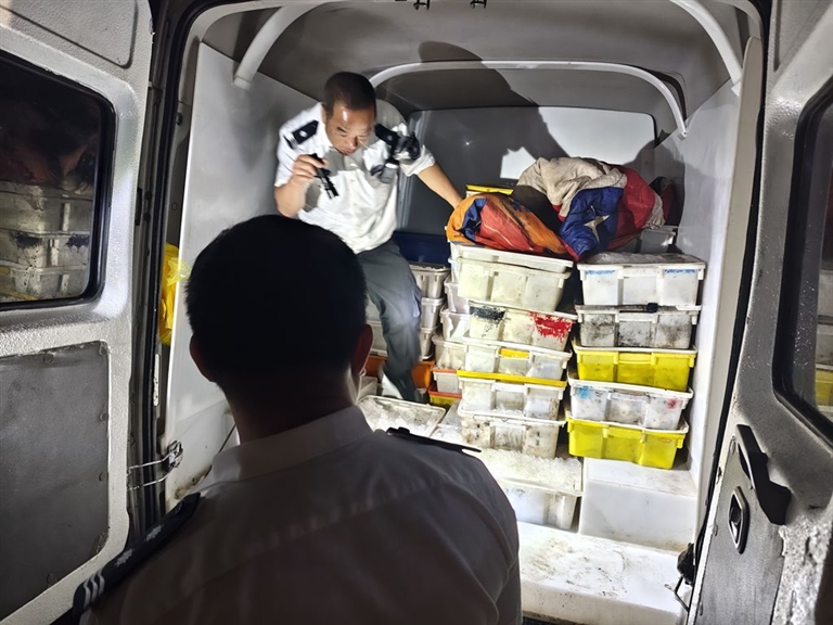 在水产城附近某停车场,执法人员发现一辆运送渔获物的电动车,车上载有3箱新鲜鲐鱼,属违禁渔获物,现场予以查扣。执法人员继续通过视频监控蹲守,在市场停车点内精准发现2辆涉嫌运送违禁渔获物货车,在公安人员的配合下,在涉案车辆后备箱查获鱿鱼、鲳鱼、马鲛鱼等80多箱违禁渔获物,依法予以扣押,下一步将按照相关法律规定予以处理。