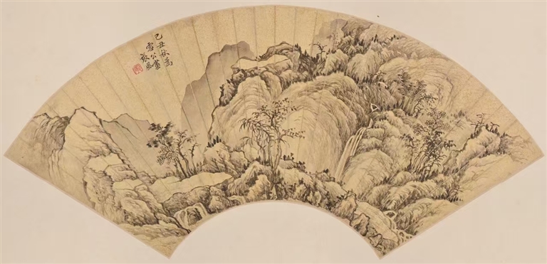 林泉飞瀑 张可大之子张风水墨洒金纸本 扇面