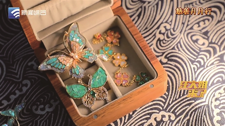 在岱山县高亭镇沙涂社区,柳舒雯的家中总是充满了艺术的气息。铺开桌布,放上原料,利用镊子、牙签、胶水等工具,柳舒雯将螺钿片一点点铺满基底,半小时左右,一只精美的非遗螺钿胸针便呈现在眼前。胸针、发夹、手链、项链……在灯光的映射下,她的作品造型各异,璀璨夺目。