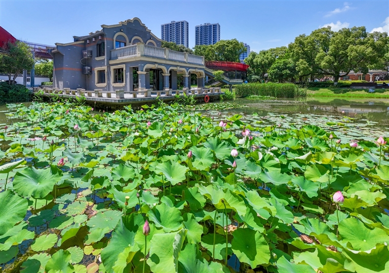 本报讯 6月6日,定海公园的荷塘已悄然换上新装。碧绿的荷叶层层叠叠铺满水面,其间点缀着星星点点初绽的荷花,有的含苞待放,有的刚刚露出嫩粉色的尖角,为夏日增添了一抹清新雅致的韵味。