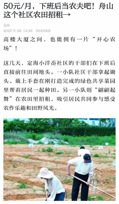 近期,定海城东街道小洋岙社区推出了72块“共享菜园”,以50平方米为单位出租,每月租金50元。目前,已有40块菜园被预定,以亲子家庭为主,也不乏退休老人(《舟山晚报》6月5日报道)。