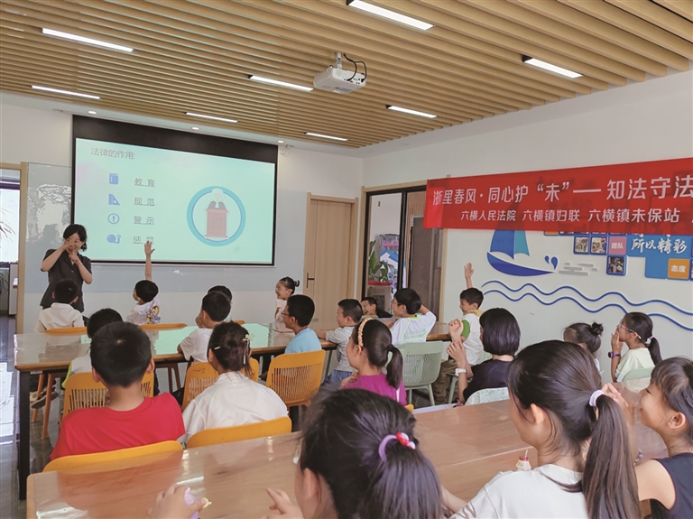 本报讯 6月15日,由六横人民法庭、六横镇妇联、镇未成年人保护工作站、海蓝社工中心联合举办的“浙里春风·同心护未”知法守法健康成长小课堂正式开课。