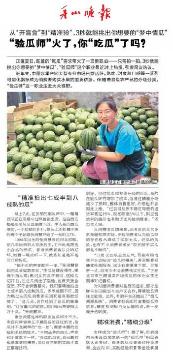 新需求总在催生新职业。近年来,水果产地大型专业市场日益活跃,熟度、甜度和口感等一系列可量化指标,成为消费者购买水果的重要依据。伴随着初级农产品的分级分类,“验瓜师”这一职业顺理成章地走进了大众视野。