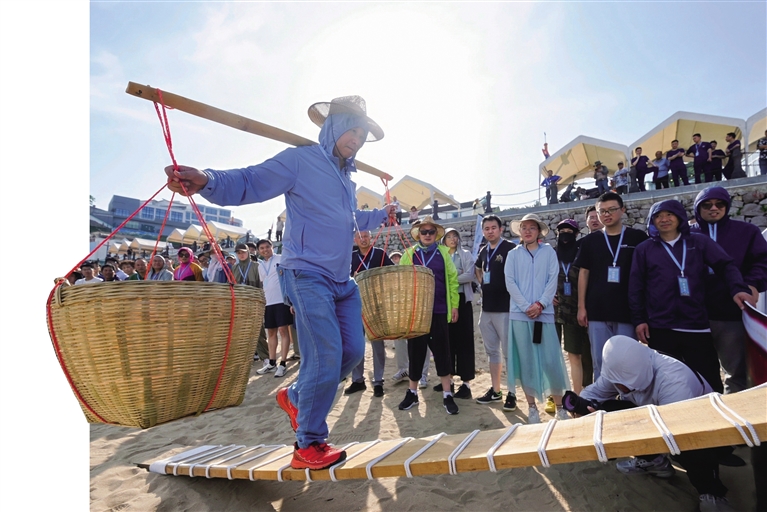 图为航海勇者挑战赛,选手挑担走跳板。记者 胡帆 姚凯乐 通讯员 赵引飞 摄
