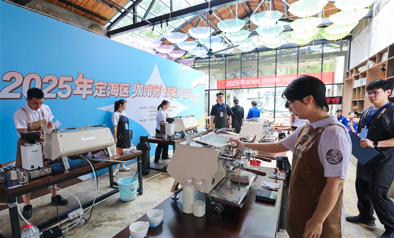 本报讯 6月20日,2025年定海区咖啡师技能大比武在干石览镇古禅林举行,33名选手走上擂台,比咖啡制作、咖啡品鉴、咖啡豆辨别……