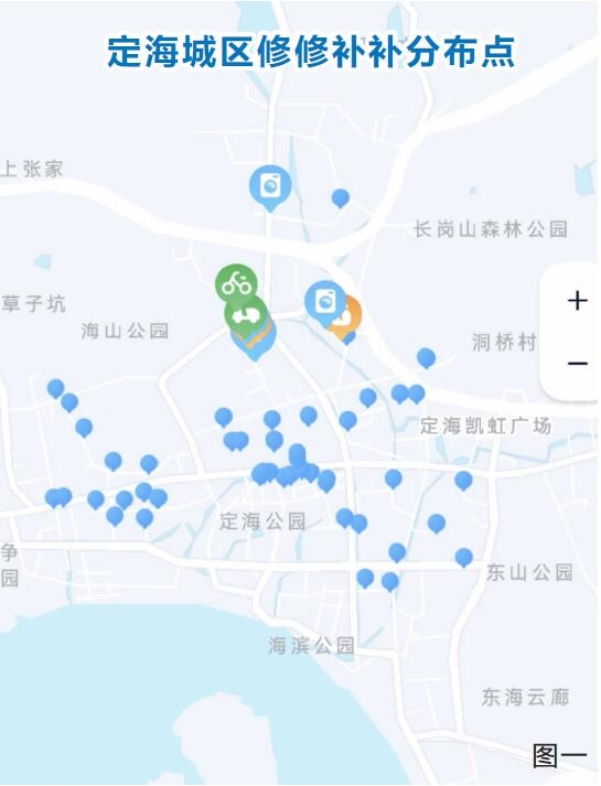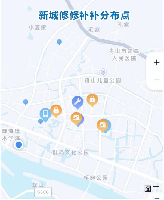 微信小程序“便民生活圈”的“小修小补”地图清晰地显示:定海(图一)、普陀老城区相关店铺分布较密,而新城(图二)、东港、定海城北等区域则分布稀疏。