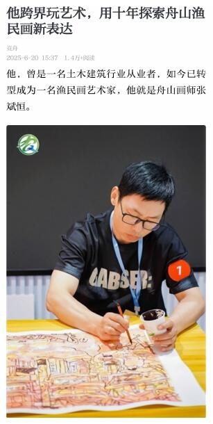 近日,《舟山晚报》“达人”版报道了画师张斌恒探索渔民画创新的十年历程。张斌恒尝试将国画皴擦法、水彩技法融入传统渔民画,也将渔民画元素融入木刻、剪纸、瓷盘等各种载体,通过创新让渔民画焕发新的活力。