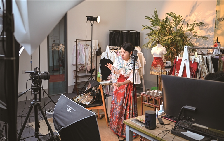 6月17日,在曹县有爱云仓汉服基地,工作人员直播推介汉服。
