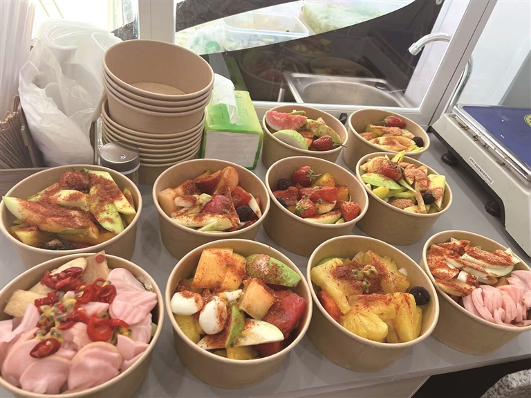 挑自己喜欢的水果放碗里,称一份,舟山媳妇韦丽香一边往里加入辣椒盐、酸梅粉、陈皮粉等调料不停地搅拌,一边热情地介绍,“这是我们广西柳州的特色水果酸嘢,酸甜脆辣,解暑又开胃。”