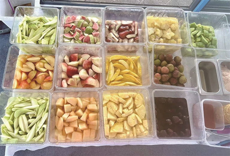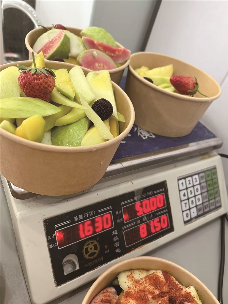 韦丽香坦言,如果刚开始就是开店的话,大家未必会进店里。但摆摊就不一样,事先切好的十几种各色水果在摊位上一一展示,一杯又一杯的水果提前都装到满杯,红红绿绿的,诱惑不止一点点。况且价格也不贵,15~20元/杯。