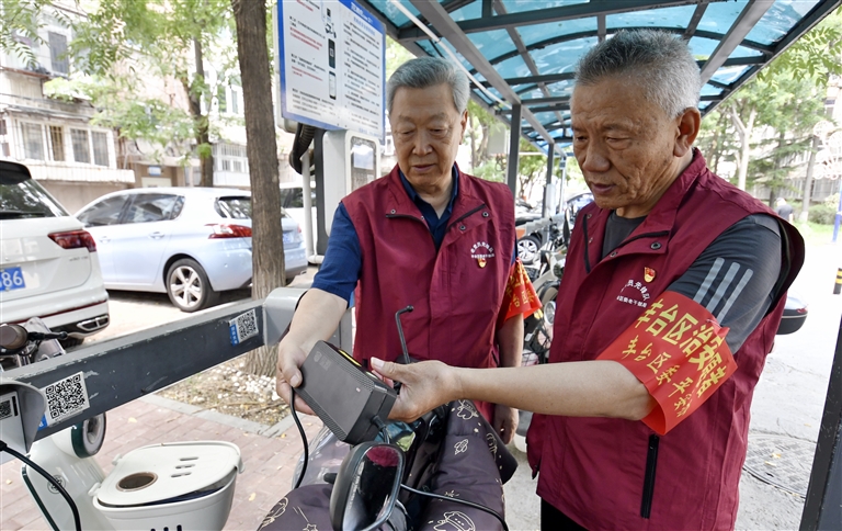 6月26日,北京市丰台区东高地街道老党员安全巡查队75岁老党员牛振杰(左)和67岁的老党员李磊在巡查电动车充电设施安全。