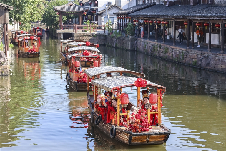 6月28日,新人乘坐婚船游览新市古镇。