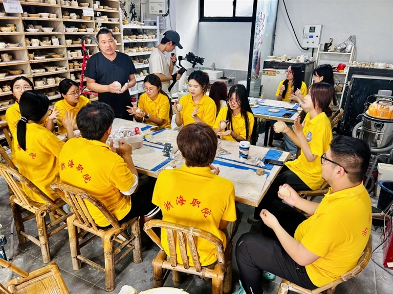 在非遗大师课堂上,舟山工艺美术学院的渔民画大师张高俊、陶艺专家丁朝夕、桔扎染技艺传承人朱水红亲临现场,以生动鲜活的示范教学,为青年学子开启海岛非遗文化之旅。