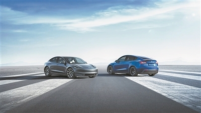 灰色的特斯拉Model 3和蓝色的特斯拉Model Y
