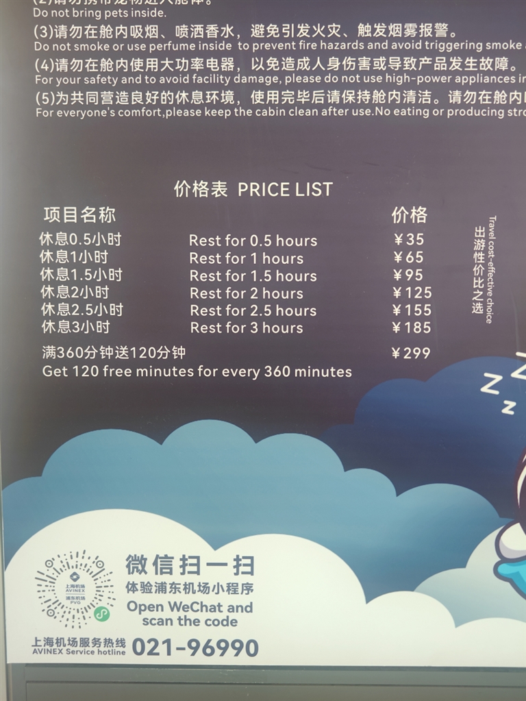 7月4日,澎湃新闻记者从睡眠舱运营商相关负责人处了解到,在浦东机场T2国际出发D65登机口处,首批13台睡眠舱已投入运营,目前24小时开放,舱内有新风系统,提供毯子,一客一清洁消毒。价格表显示,休息半小时35元、一小时65元、1.5小时95元、2小时125元、3小时185元,满360分钟送120分钟、也就是8小时299元。