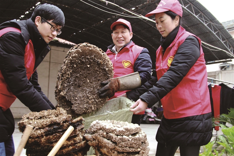 杨秀青组织成立新居民义工灭蜂队,他和家人将清除的蜂巢装袋处理
