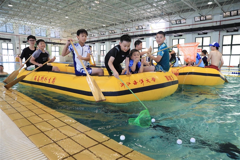 近日,在浙江海洋大学游泳馆内,来自嵊州市逸夫小学的35名“小海员”在老师们的带领下先后接受海上安全知识学习,并进行桨板救援、大黄艇抓“鸭子”趣味赛等体验,提升水上救生技能。