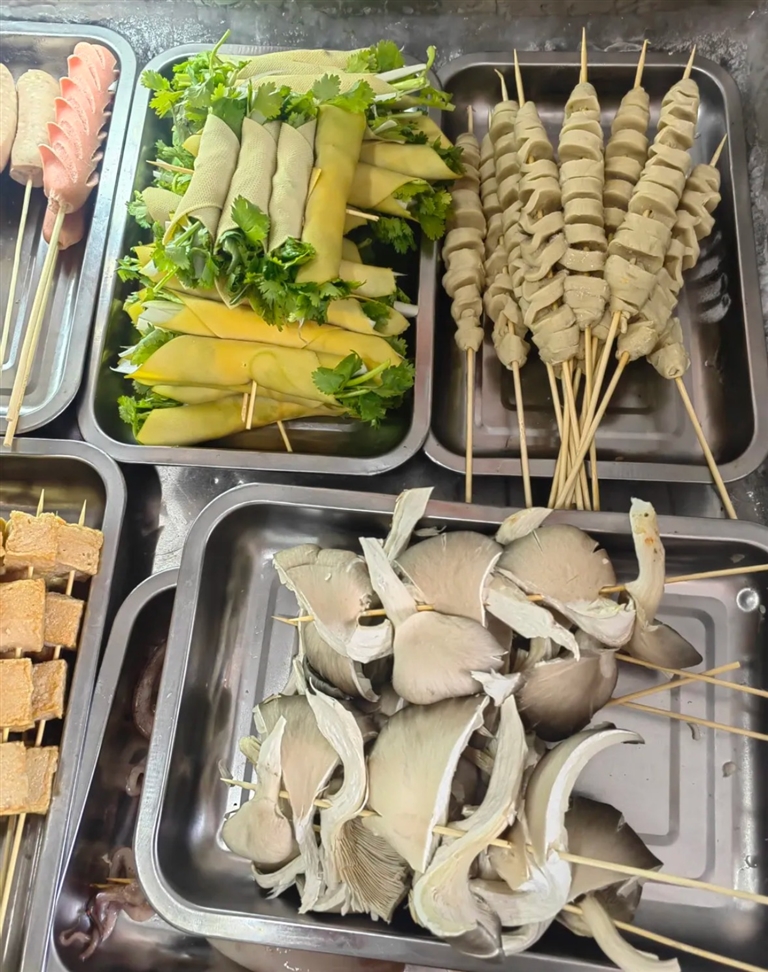 店内的各式炸串亦是亮点,坚持每日现穿,不少品类还原汁原味地保留了东北特色。李世强介绍,诸如鸡胗、鸡心、特定款式的火腿肠等,均从东北直接发货,“个头比本地买的大,价格也更实惠。”