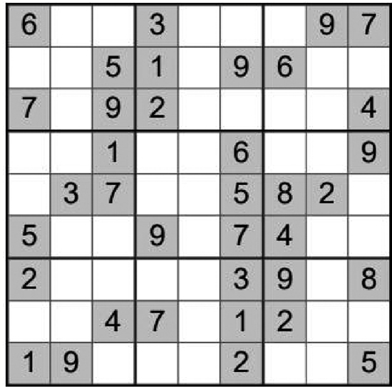 在空白格填入数字,使其每行、每列、每一个粗线格(3×3)内的数字为1~9,不重复。