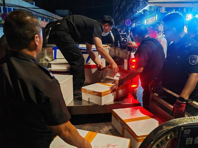 本报讯 7月12日凌晨,由普陀区海洋行政执法中队牵头,联合沈家门综合行政执法队、沈家门派出所组成专项执法检查组,对舟山国际水产城周边重点区域开展违禁渔获物检查。此次行动共查获违禁渔获物473公斤。
