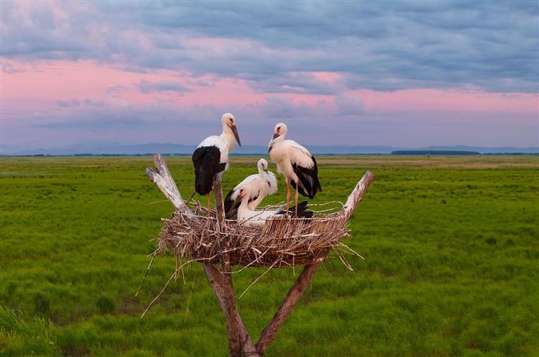 盛夏时节,在位于黑龙江省富锦市的黑龙江三环泡国家级自然保护区,人工巢内的东方白鹳雏鸟羽翼渐丰,即将离巢。据保护区管理局介绍,保护区在落马湖管护站搭建的20个人工巢今年全部“入住”东方白鹳,共孵育雏鸟70余只。 新华社发(曲玉宝 摄)