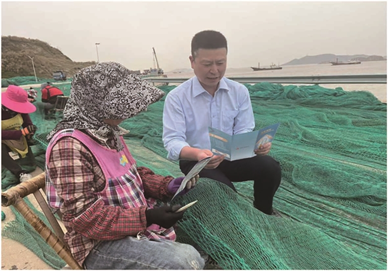 日前,建设银行岱山衢山支行的乡村振兴服务团队来到码头,向当地渔民宣传金融知识 (刘宇 摄)
