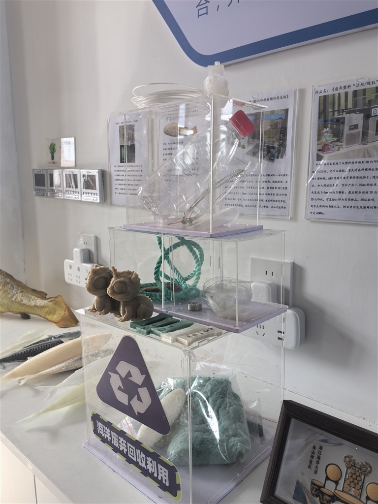 近期,该实验室成功研发塑料瓶循环再生机,通过3D打印技术,将废弃塑料瓶循环利用,打印出各类塑料制品。同时,针对各类海洋废弃塑料的拉丝造粒一体机也取得了重大突破,已完成工程样机测试。