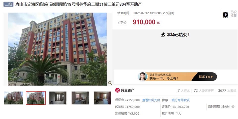 另外,6月初,在阿里法拍市场成交了一套柏悦溪湖一楼114.63平方米的成品装修房,成交价为115万元,竞得者也是舟山一家房产中介机构。后来,这套房以130万元的价格包税成交。