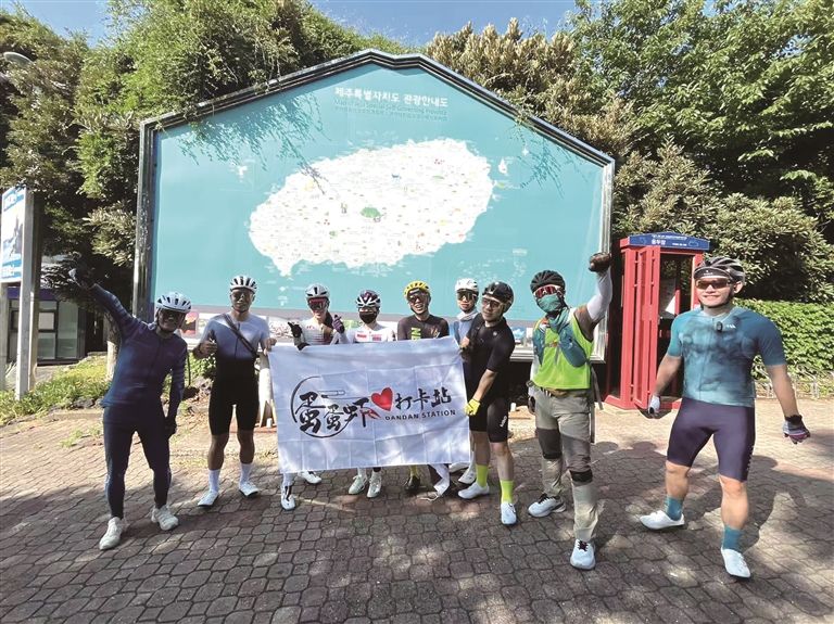 济州岛的七月骄阳似火,35摄氏度的高温炙烤着大地。环岛路一侧,一条醒目的蓝色骑行线如缎带般延伸。我们每人手持一本“骑行护照”,穿越着联合国认证的世界自然遗产,沿途经过不同的打卡点都要一一盖章。