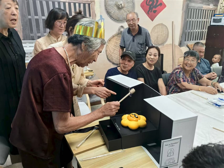 “今天,我们鼓吹山的老人们聚在一起,为4位寿星过生日,希望大家都身体健康、开心快乐!” 三与叁山蛋糕舟山店负责人王聪红站在人群中间笑着宣布生日会开始。她特意从慈溪赶回来,不仅带来了蛋糕,还主动当起了主持人。话音刚落,老人们就跟着鼓起掌来。