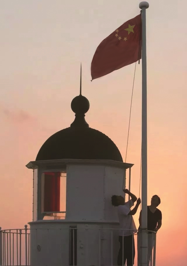 2007年6月,洛迦山灯塔上,於水平和妻子夏友菊升国旗资料图片
