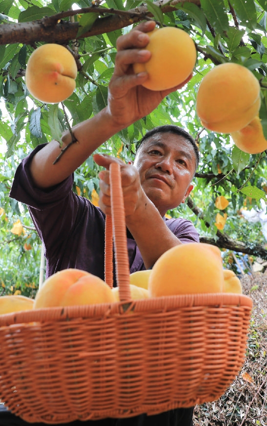 昨天,在定海区干石览镇双庙村天牧园农业专业合作社生态桃园内,果农陈昊种植的170亩黄桃迎来丰收季。据介绍,今年的黄桃产量高于去年,预计总产量在5万公斤以上,根据大小不同每公斤能卖到16到40元不等。