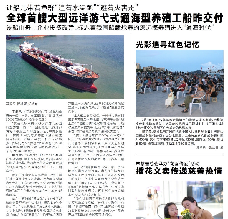 7月20日,在河北秦皇岛山海关一船厂码头由舟山企业森海牧歌(浙江)海洋科技有限公司投资改建的“浙岱渔养60001”船正式命名交付,这是全球首艘大型远洋游弋式通海型养殖工船标志着我国船载舱养的深远海养殖进入全新的“通海时代”(《舟山晚报》7月21日报道)。