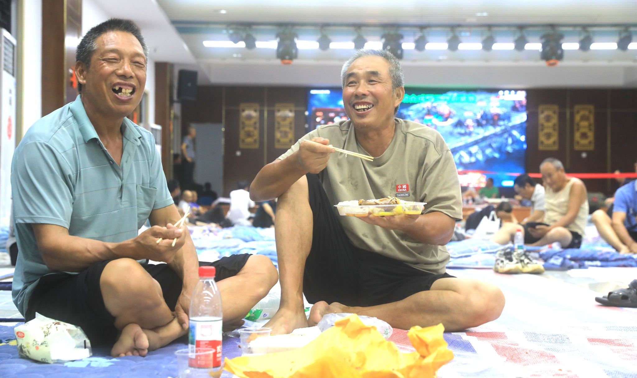 昨晚,一批重点项目施工人员被转移至金塘山潭文化大礼堂安置点 记者 陈永建 摄